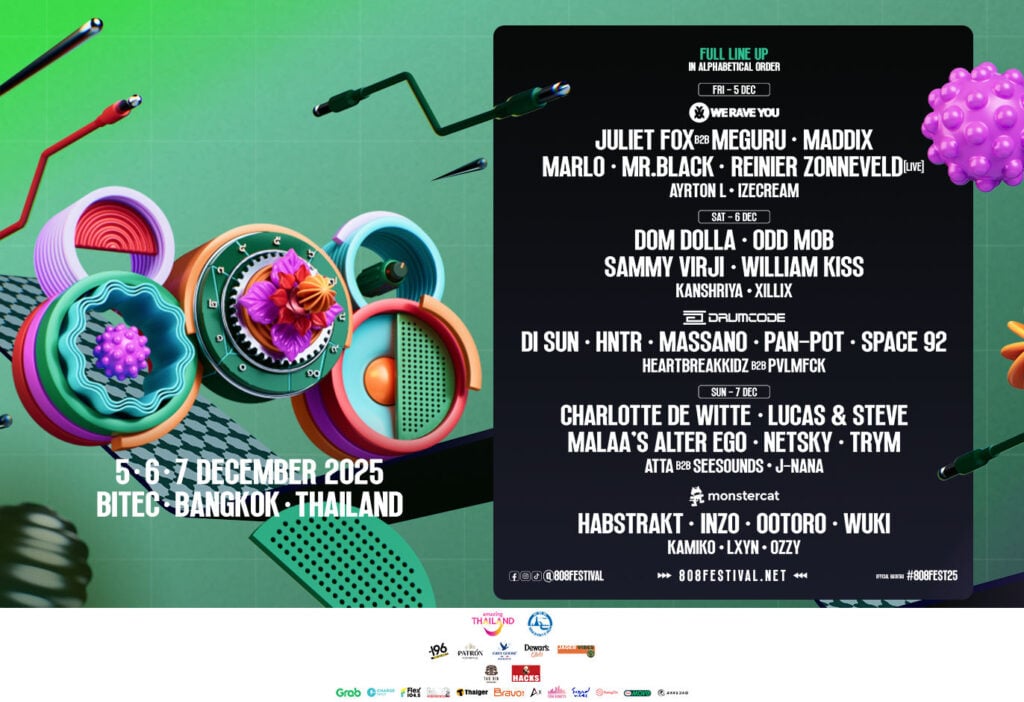 ปีนี้ 808 Festival จัดหนักด้วยทัพศิลปินระดับโลกแบบครอบคลุมทุกสไตล์ ไม่ว่าจะเป็น Dom Dolla ศิลปิน House ผู้สร้างฮิตระดับโลกอย่าง Take It ที่พาเทรนด์มิวสิกเฟสติวัลไปอีกขั้น Charlotte de Witte เจ้าแม่ Techno อันดับหนึ่งจากเบลเยียม พร้อมลายเซ็นซาวด์ดิบ หนัก และทรงพลัง Maddix ผู้ผลักดันกระแส Big Room Techno ด้วยพลังดนตรีเฉพาะตัว Juliet Fox, PAN-POT, Space 92, Odd Mob, Sammy Virji, HNTR, William Kiss รวมถึงโชว์ไลฟ์สุดยิ่งใหญ่จาก Reinier Zonneveld