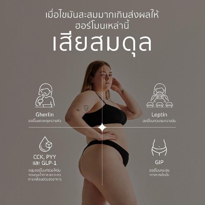 • ฮอร์โมนเลปติน (Leptin) – มีบทบาทสำคัญในการควบคุมความอิ่มของร่างกาย โดยระดับของเลปตินสัมพันธ์กับตามปริมาณเซลล์ไขมันที่มีอยู่ เมื่อร่างกายมีไขมันสะสมมากขึ้น ร่างกายจะพยายามหลั่งเลปตินมากขึ้น จนเกิดภาวะดื้อต่อเลปติน (Leptin resistance) กล่าวคือ ความอยากอาหารไม่ได้ลดลง แม้ระดับเลปตินจะสูงมากแล้วก็ตาม