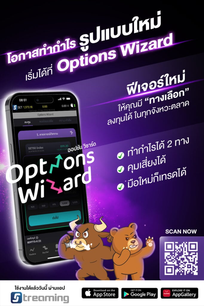 หนึ่งในฟีเจอร์ที่ทำให้ Streaming โดดเด่นกว่าใครในปี 2026 คือ Options Wizard ซึ่งถูกออกแบบมาเพื่อทลายกำแพงระหว่างมือใหม่กับโลกของ Options โดยเฉพาะ เป็นโอกาสทำกำไรรูปแบบใหม่ เพียงคาดการณ์ทิศทางตลาด (SET50 Options) หรือทิศทางค่าเงินดอลลาร์ (USD Options)
