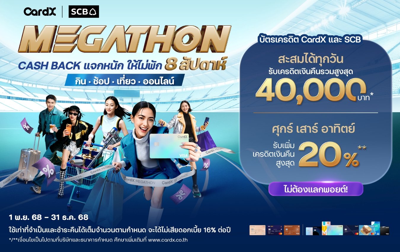 CardX ผู้ให้บริการบัตรเครดิตและสินเชื่อบุคคลภายใต้กลุ่มเอสซีบีเอกซ์ ตอบรับเทรนด์การใช้จ่ายผ่านบัตรของคนไทยในปี 2568 ที่เติบโตโดดเด่นใน 4 หมวดหลัก ได้แก่ ‘กิน-ช้อปปิ้ง-ท่องเที่ยว-ออนไลน์’ สะท้อนพฤติกรรมผู้บริโภคที่มุ่งใช้จ่ายเพื่อความสุขและคุณภาพชีวิตที่จับต้องได้ ด้วยการส่งแคมเปญใหญ่ ‘MEGATHON รวมตัวแบรนด์ดัง แจกหนักไม่พัก คุ้มดับเบิ้ลตลอด 8 สัปดาห์’ พร้อมมอบเครดิตเงินคืนรวมสูงสุด 42,500 บาท*/** โดยไม่ต้องใช้พอยต์แลก ตั้งแต่วันที่ 1 พฤศจิกายน – 31 ธันวาคม 2568