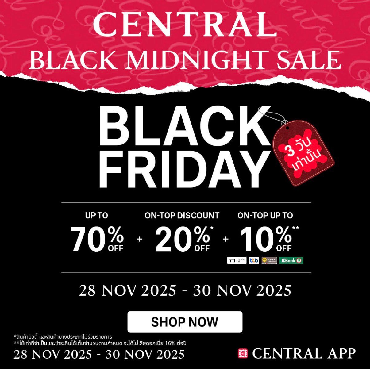 เซอร์ไพรส์ใหญ่วัน Black Friday ห้างเซ็นทรัล จัดโปรพิเศษ ช้อป Blackfriday ต้องที่ Central Black Midnight Sale ลดทุกชั้น ทุกแผนกสูงสุด 70% แจก Special Coupon ลดสูงสุด 20% ซื้อ 1 แถม 1 และดีลเด็ดอีกเพียบ