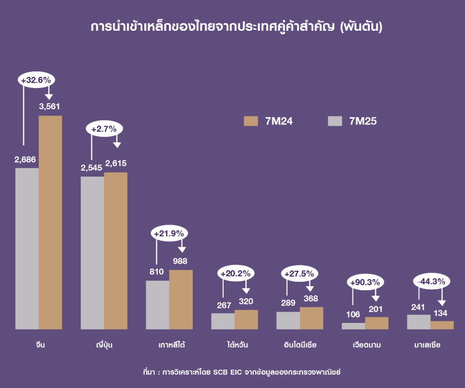 ตัวเลขการนำเข้าเหล็กของไทยจากคู่ค้าสำคัญ ปี 2025 ช่วง 7 เดือนแรก (เทียบกับปีก่อน) น่าจะฉายภาพให้เราเห็นได้ชัดเจน