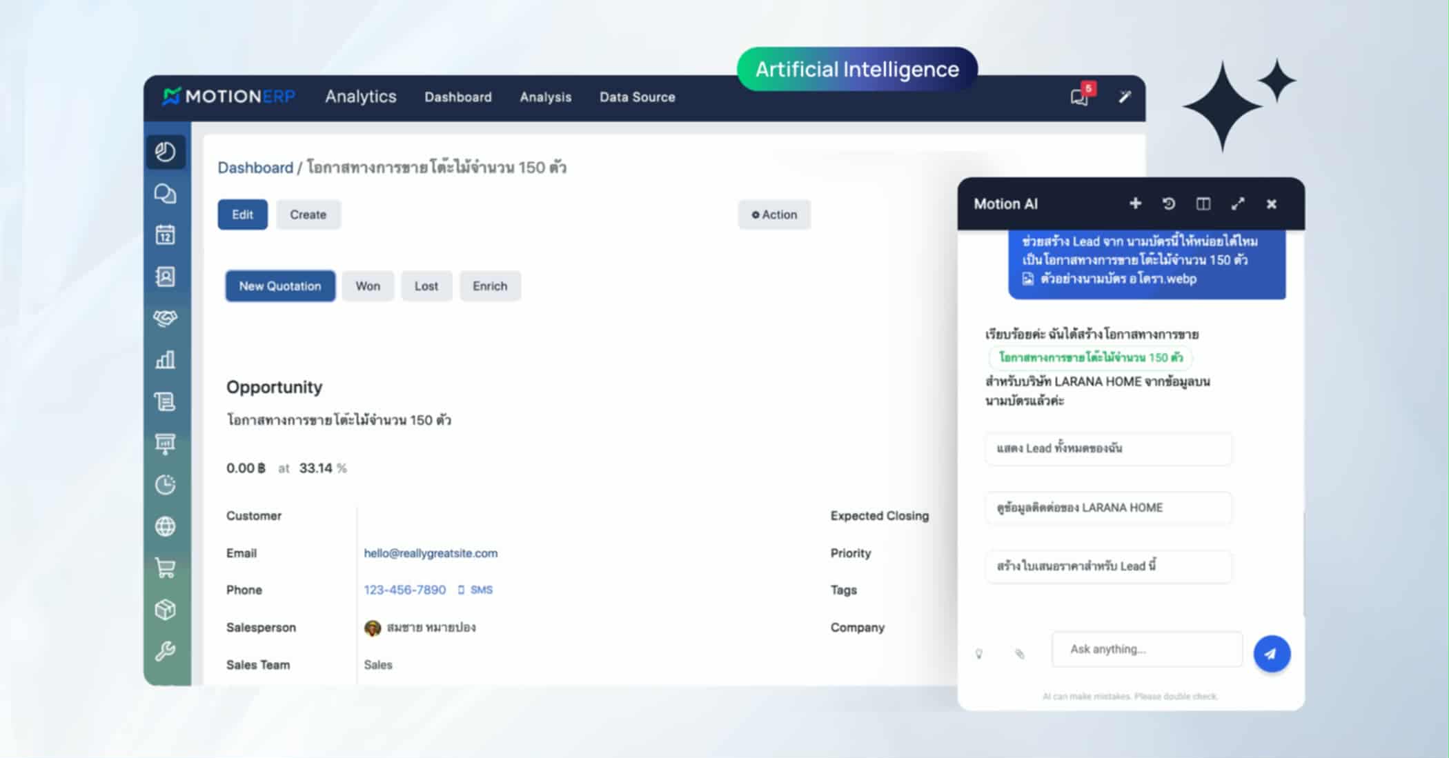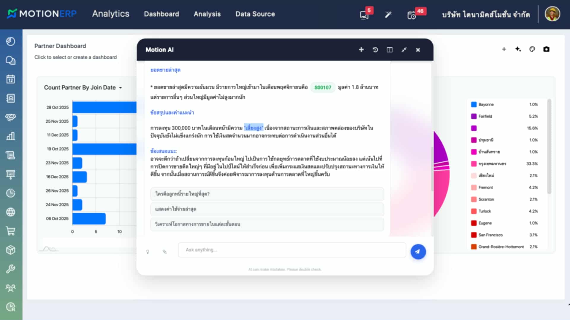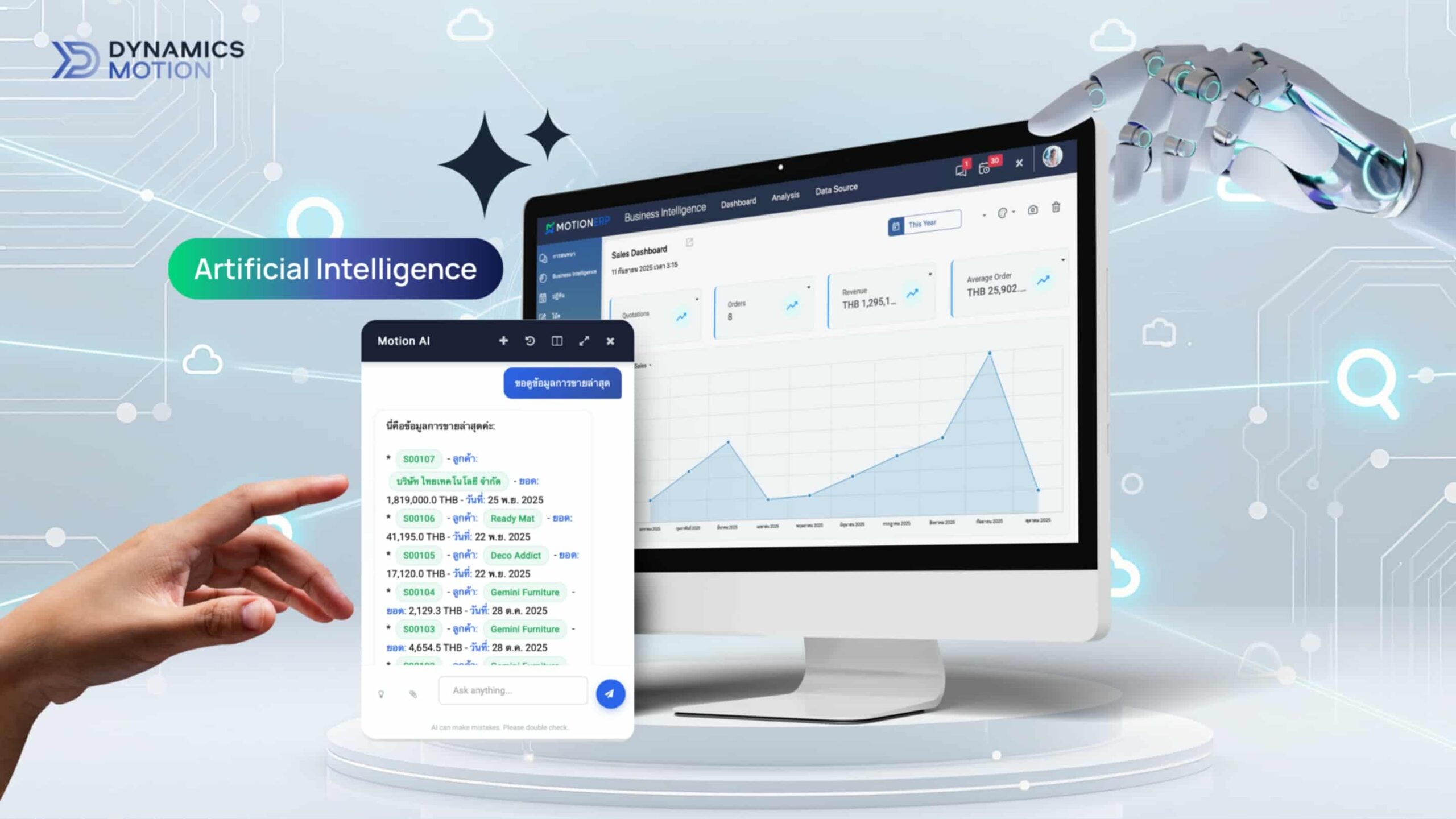 ความแตกต่างของ AI ใน Motion ERP เวอร์ชั่นใหม่นี้มาในรูปแบบ “สมองของธุรกิจ” คือการประมวลผลความสัมพันธ์ข้อมูลทั้งหมดของธุรกิจที่ซับซ้อนได้เร็วและลึกกว่าเดิม โดยทั่วไปผู้บริหารมักวิเคราะห์ความเชื่อมโยงได้ราว 2 – 3 มิติ (ยอดขาย/สั่งซื้อ/บัญชี) แต่ AI ในระบบ ERP สามารถเชื่อมโยงได้ถึง 10 มิติ ภายในไม่กี่วินาที ทำให้เห็นเหตุและผลแบบลูกโซ่ เห็นภาพธุรกิจโดยรวมได้ชัดขึ้น ครอบคลุมการทำงานส่วนงานต่างๆไม่ให้ติดขัดอีกต่อไป เช่น