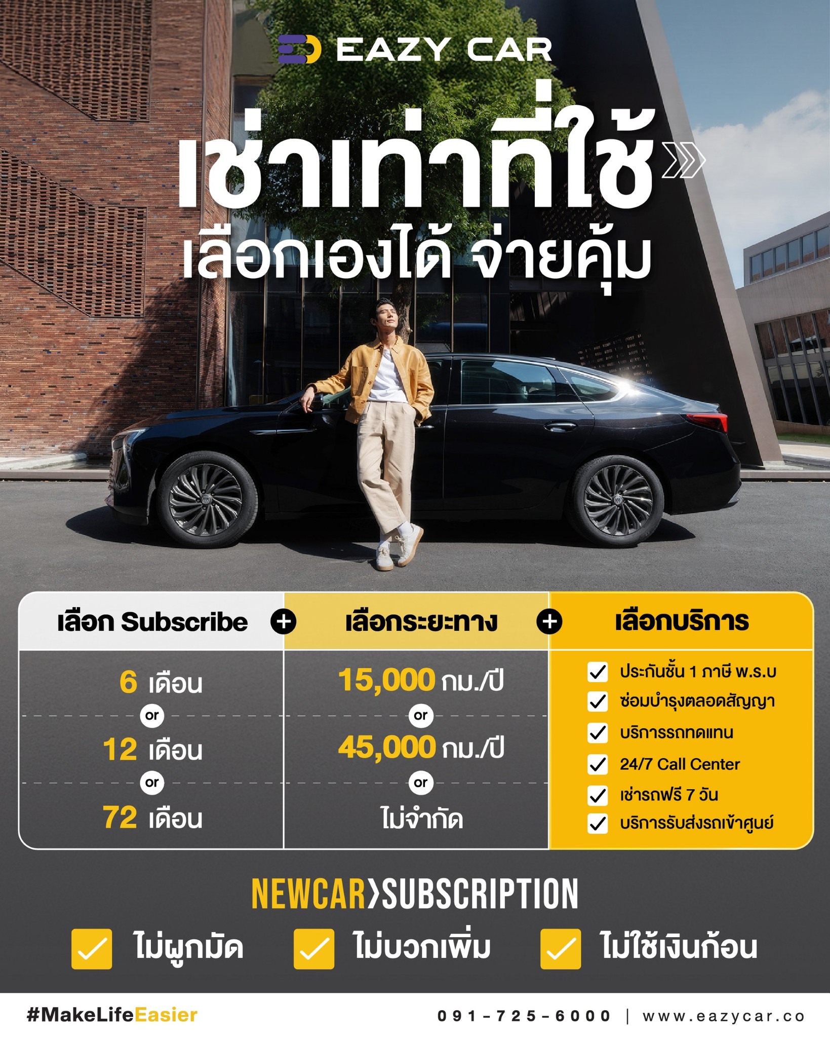 อยากมีรถใช้ แต่ไม่ต้องซื้อรถก็ได้ ตรงกับไลฟ์สไตล์คนรุ่นใหม่ ไม่ต้องกังวลว่าจะซื้อรถยนต์ไฟฟ้าหรือรถยนต์น้ำมัน แต่มาใช้บริการ Eazy Car ที่ให้บริการแบบ Car Subscription ไม่ต้องกังวลเรื่องค่าใช้จ่ายในการดูแลรถ ไม่ว่าจะ ภาษี พรบ. ประกันภัย และค่าบำรุงรักษา รวมถึงค่าใช้จ่ายแอบแฝงอื่นๆ โดยล่าสุด มีลูกค้า Subscriber เพิ่มขึ้น 50% ตอกย้ำว่าเป็นบริการที่ตรงใจคนรุ่นใหม่ พร้อมกับเปิดเทรนด์ใหม่ผู้บริโภคเช่าใช้รถยนต์ป้ายแดง 1 ปี