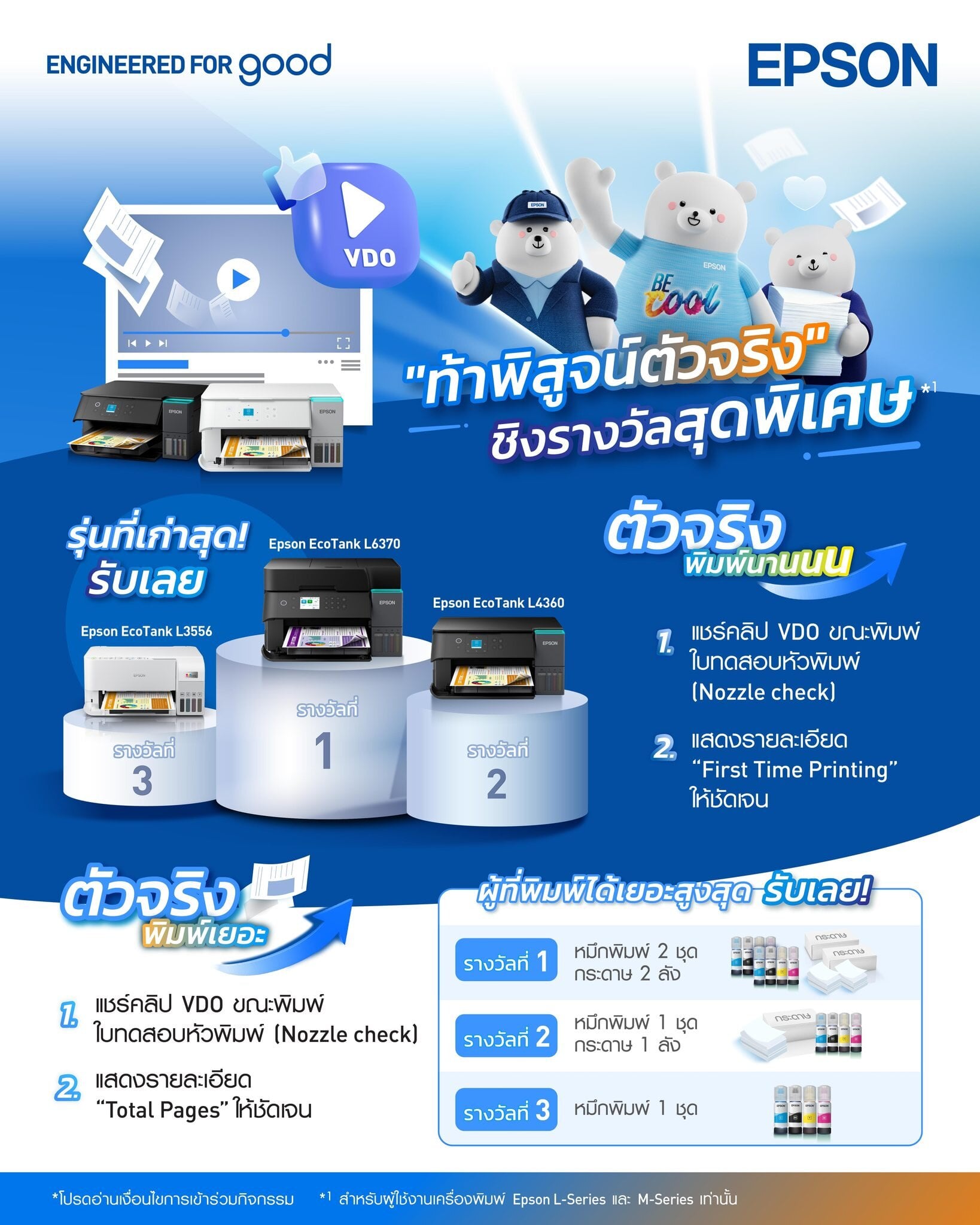 ตัวจริงพิมพ์เยอะ ผู้ร่วมกิจกรรมต้องแสดงข้อมูล “Total Pages” ในใบทดสอบหัวพิมพ์ โดยผู้ที่มีจำนวนหน้าการพิมพ์สูงสุด 3 อันดับแรก จะได้รับรางวัลหมึกพิมพ์ Epson พร้อมกระดาษพิมพ์ ทั้งนี้ หมึกพิมพ์ที่มอบให้แก่ผู้ชนะจะเป็นรุ่นที่สอดคล้องกับเครื่องพิมพ์ Epson EcoTank ที่ใช้เข้าร่วมกิจกรรม