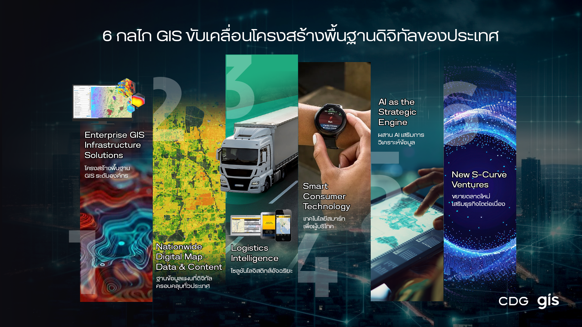 6. GIS Driver 6: New S‑Curve Ventures: ขับเคลื่อนการเติบโตระยะยาวด้วยการต่อยอดความเชี่ยวชาญด้านเทคโนโลยี GIS สู่ตลาดต่างประเทศ พร้อมขยายบทบาทสู่การเป็นพันธมิตรทางเทคโนโลยีในระดับสากล ควบคู่กับการสำรวจและพัฒนาธุรกิจใหม่ที่ต่อยอดจากศักยภาพของ GIS เพื่อสร้างโอกาสทางธุรกิจใหม่และเสริมขีดความสามารถขององค์กรในอนาคต