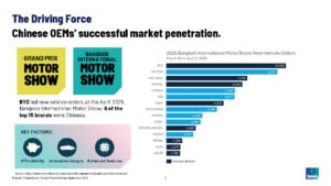 การแข่งขันในตลาดนี้ถูกขับเคลื่อนอย่างหนักจากผู้ผลิตจีน โดยในงาน Bangkok International Motor Show 2025 พบว่า 8 จาก 15 อันดับแบรนด์ที่มียอดจองสูงสุดเป็นแบรนด์จีน