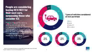 โดยเฉพาะกลุ่มอายุ 30-44 ปีที่ให้ความสนใจรถ BEV สูงถึง 34% ตามมาด้วยกลุ่มอายุ 45-65 ปีที่ให้ความสนใจ 32% ส่วนกลุ่มอายุ 20-29 ปีให้ความสนใจเพียง 29% เพราะกลุ่มนี้ให้ความสนใจรถไฮบริดมากกว่า ซึ่งอยู่ที่ 33%