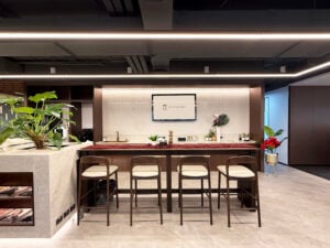 สำหรับพื้นที่ส่วนกลาง มีการออกแบบเพื่อให้เข้ากับไลฟ์สไตล์การทำงานของคนยุคใหม่ เฟอร์นิเจอร์สั่งทำพิเศษปรับบรรยากาศให้ดูอบอุ่นและเรียบหรูในเวลาเดียวกัน