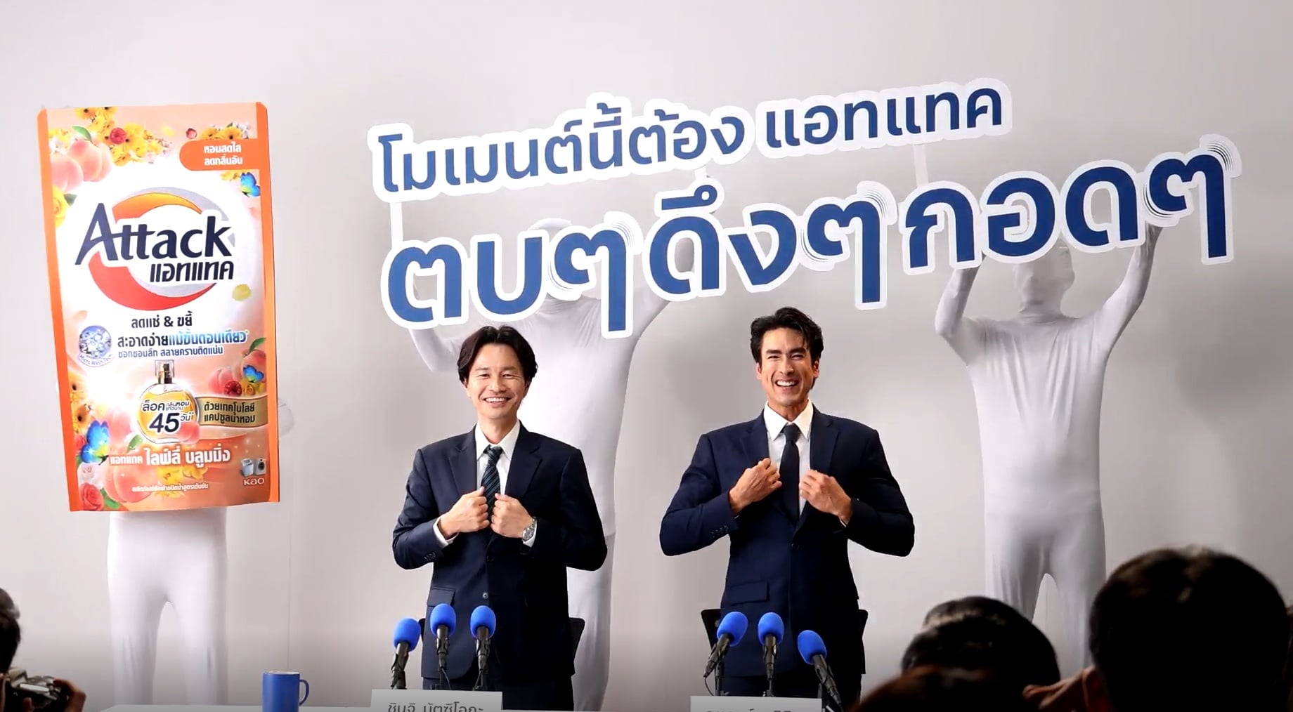 ชินจิ มัตซึโอกะ รองประธานส่วนการตลาด ธุรกิจสินค้าอุปโภค บริษัท คาโอ อินดัสเตรียล (ประเทศไทย) จำกัด กล่าวว่า “จากแนวโน้มตลาดผลิตภัณฑ์ซักผ้า นอกจากเรื่องความสะอาดแล้ว ผู้บริโภคมีแนวโน้มให้ความสำคัญกับเรื่องกลิ่นหอมของเสื้อผ้ามากขึ้น โดยเฉพาะกลุ่มครอบครัวและคนทำงานที่ต้องการเสื้อผ้าที่มีกลิ่นหอมระหว่างวัน ‘คาโอ’ จึงมุ่งมั่นผลักดันแบรนด์ ‘แอทแทค’ ให้เป็นมากกว่าผลิตภัณฑ์ซักผ้า แต่เป็นเสมือน ‘ผู้ช่วยในชีวิตประจำวัน’ ของทุกบ้าน และความตั้งใจของแบรนด์ที่จะช่วยลดภาระงานซัก เพิ่มเวลาความสุข ทำให้การดูแลเสื้อผ้าเป็นเรื่องง่าย สะดวก และประหยัดเวลา ใช้นวัตกรรมช่วยยกระดับคุณภาพชีวิต เพื่อตอบโจทย์ไลฟ์สไตล์ของครอบครัวยุคใหม่ และการมาร่วมแสดงโฆษณาครั้งแรกร่วมกับพรีเซนเตอร์ของแอทแทคอย่างคุณณเดชน์ คูกิมิยะ ก็เพื่อให้ลูกค้าทุกคนได้มั่นใจในคุณภาพของผลิตภัณฑ์นี้ และอยากให้ทุกคนได้ลองสัมผัสประสบการณ์กับผลิตภัณฑ์ด้วยตัวเองจริง ๆ”
