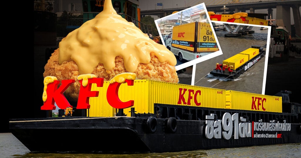 รอบก่อนเพิ่งยกเอา ‘ผู้พัน’ ไปขี่ (ตึก) ช้างมาหยกๆ รอบนี้จะเล็กกว่าก็คงไม่ได้ KFC ประเทศไทยจัดคอนเทนเนอร์ขนส่งชีสขนาดใหญ่ ล่องผ่านแม่น้ำเจ้าพระยา สร้างความฮือฮาและไวรัลบนโซเชียลมีเดีย