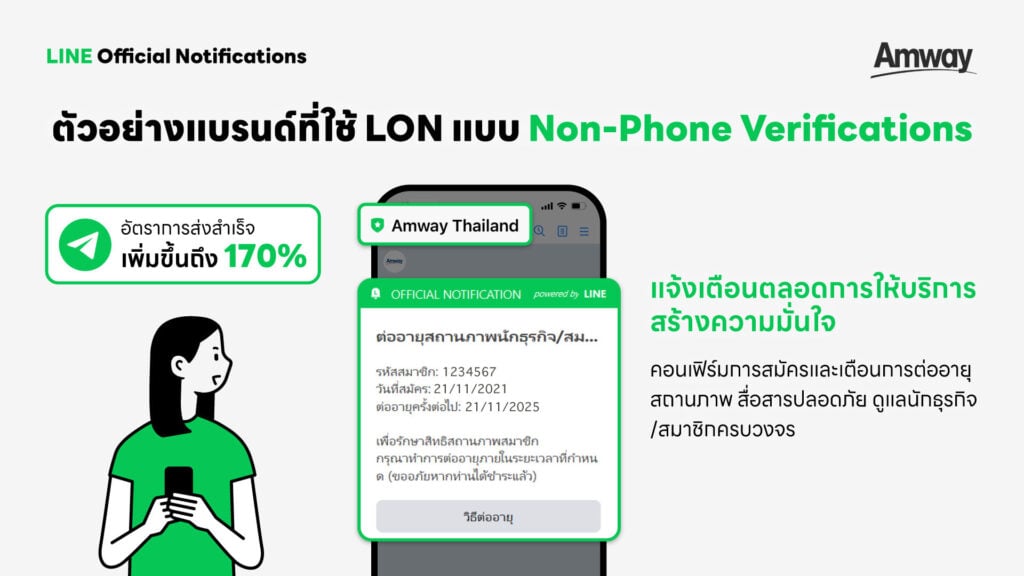หลังเปลี่ยนมาใช้ LON แบบ Non-Phone Verification แอมเวย์ มีอัตราการส่งข้อความสำเร็จเพิ่มขึ้นถึง 170% สะท้อนการเข้าถึงลูกค้าใหม่และรักษาฐานสมาชิกเดิมผ่าน LON ได้อย่างมีประสิทธิภาพและราบรื่นยิ่งขึ้น