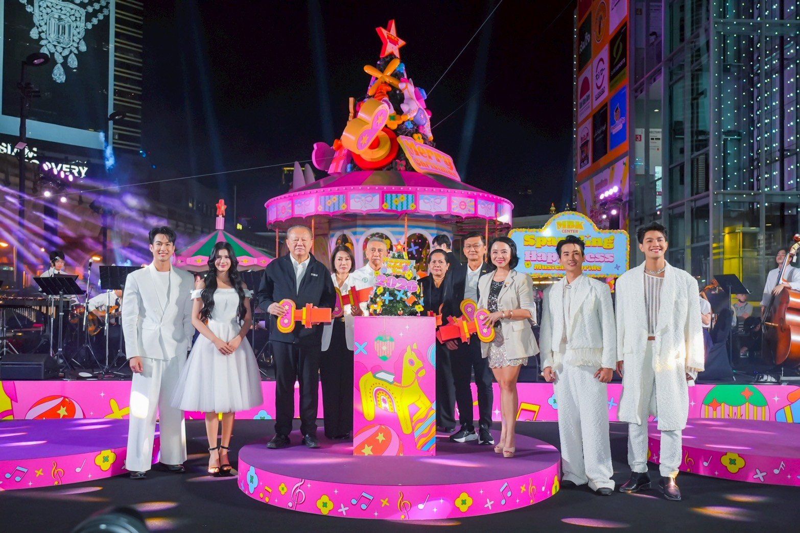 ในพิธีเปิดไฟต้นคริสต์มาสสุดตระการตา MBK Center Sparkling Happiness Light Up Ceremony ผสมผสานศิลปะ แสง สี เสียง และจังหวะดนตรีอย่างกลมกล่อม ไฮไลต์ของการแสดงสุดพิเศษของ วงดนตรีออเคสตร้า ที่บรรเลงบทเพลงแห่งความสุขอย่างอ่อนโยนและสง่างาม สร้างบรรยากาศแห่งการเฉลิมฉลองให้เปี่ยมด้วยเสน่ห์และความอบอุ่นหัวใจ ทั้งนี้ได้รับเกียรติจากพันธมิตรภาครัฐร่วมเปิดไฟต้นคริสต์มาสอย่างเป็นทางการ นำโดย นายต่อศักดิ์ โชติมงคล ประธานที่ปรึกษาผู้ว่าราชการ กรุงเทพมหานคร นางสาวพุทธชาด ศรีนิศากร ประธานเจ้าหน้าที่บริหารสายการตลาด บริษัท เอ็ม บี เค จำกัด (มหาชน) ดร.เกศี จันทราประภาวัฒน์ ที่ปรึกษาผู้ว่าราชการกรุงเทพมหานคร พล.ต.อ.อดิศร์ งามจิตสุขศรี ที่ปรึกษาของผู้ว่าราชการกรุงเทพมหานคร นายอภิชาติ กมลธรรม ประธานเจ้าหน้าที่บริหารสายกฎหมาย บริษัท เอ็ม บี เค จำกัด (มหาชน) ว่าที่ร้อยตรี ปราโมทย์ เลิศจิตรการุณ ผู้อำนวยการสำนักนันทนาการกรมพลศึกษา นางศุภพิชญาณ์ ชาวบางรัก ผู้ช่วยผู้อำนวยการเขตปทุมวัน และ นางสาวพิมลพันธุ์ ฤทธิบุญไชย หัวหน้าฝ่ายสื่อสารและประชาสัมพันธ์ หอศิลปกรุงเทพฯ ร่วมพิธีเปิดไฟต้นคริสต์มาสอย่างเป็นทางการ
