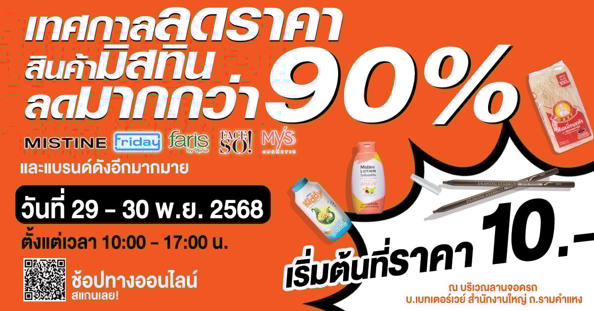กลับมาแล้วปีละครั้งเท่านั้น! กับ “เทศกาลลดราคา สินค้ามิสทิน และแบรนด์ดัง” ลดแรงสะเทือนวงการความงาม สูงสุดกว่า 90% ทั้งแบรนด์ MISTINE, Friday, FARIS by Naris และอีกหลายแบรนด์ดัง ที่ขนทัพสินค้าคุณภาพมาลดแบบจัดเต็ม! วันที่ 29-30 พฤศจิกายน 2568 เวลา 10.00 น. ถึง 17.00 น. ณ บริเวณลานจอดรถอาคาร 7 บริษัท เบทเตอร์เวย์ (ประเทศไทย) จำกัด
