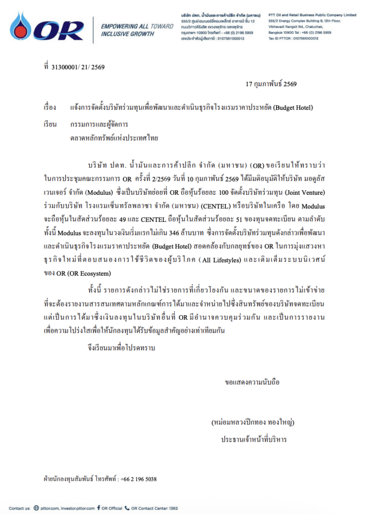 โดยรายละเอียดทั้งหมดออกมาหลังทาง OR ได้แจ้งต่อตลาดหลักทรัพย์แห่งประเทศไทย เผยว่า บริษัท มอดูลัส เวนเจอร์ จำกัด หรือ Modulus บริษัทย่อยของ OR ได้จัดตั้งบริษัทร่วมทุน (Joint Venture) ร่วมกับ บริษัท โรงแรมเซ็นทรัลพลาซา จำกัด (มหาชน) โดย OR จะถือหุ้นในสัดส่วนร้อยละ 49 และ CENTEL ถือหุ้นในสัดส่วน 51% ของทุนจดทะเบียน และ Modulus จะลงทุนในวงเงินเริ่มแรกไม่เกิน 346 ล้านบาท