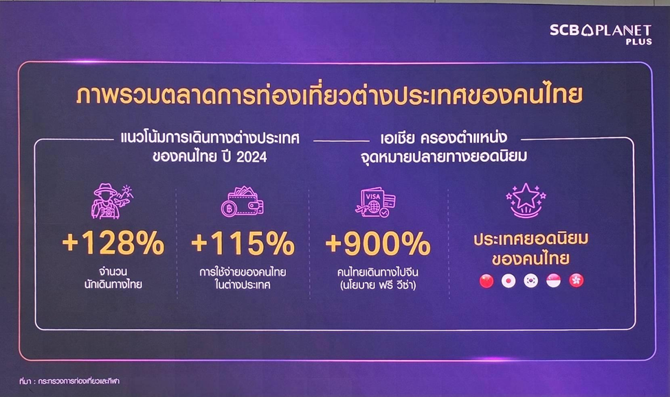 ภาพรวมตลาด Outbound (คนไทยเที่ยวต่างประเทศ) ในปี 2024 กลับมาคึกคักแบบก้าวกระโดด จำนวนนักท่องเที่ยวไทยเดินทางออกนอกประเทศเติบโต 128% และยอดการใช้จ่ายเติบโต 115% แต่ตัวเลขที่น่าตกใจที่สุดคือ คนไทยเดินทางไปจีนพุ่งสูงกว่า 900% ซึ่งเป็นผลจากนโยบายฟรีวีซ่า ทำให้เอเชีย (จีน, ญี่ปุ่น, เกาหลีใต้, สิงคโปร์, ฮ่องกง) ยังคงครองแชมป์จุดหมายปลายทางยอดฮิต