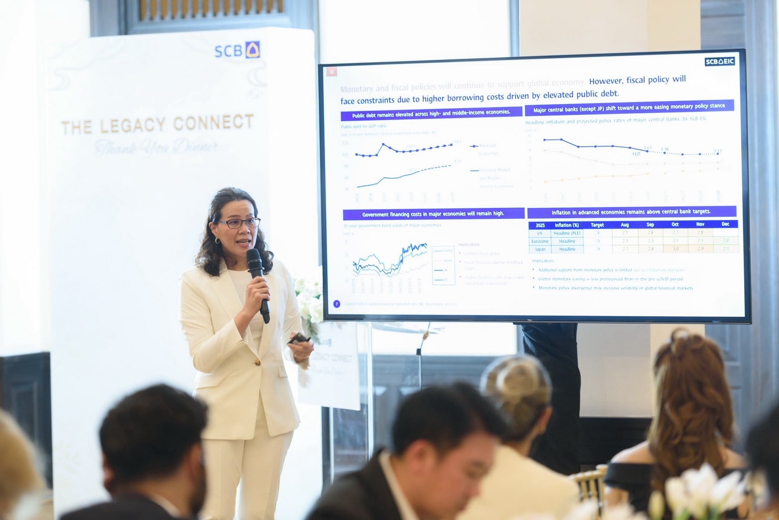 ภายในงานได้รับเกียรติจากคณะผู้บริหารระดับสูงและผู้เชี่ยวชาญจากธนาคารไทยพาณิชย์มาร่วมถ่ายทอดข้อมูลเชิงลึกแบบรอบด้าน ทั้งในมิติ ทั้งแนวโน้มเศรษฐกิจมหภาค Global Trade และข้อมูลตลาดเชิงลึกเพื่อช่วยให้ผู้ประกอบการสามารถตัดสินใจเชิงกลยุทธ์ได้อย่างมั่นใจ พร้อมเตรียมรับมือความท้าทายของปี 2569 ที่มีความไม่แน่นอนสูง โดยมี ธนวัฒน์ กิตติสุวรรณ รองผู้จัดการใหญ่ Head of Digital Business and Payment Solutions และ ฐิติมา ชูเชิด Head of Macroeconomic Research Division ศูนย์วิจัยเศรษฐกิจและธุรกิจ (SCB EIC) ศลิษา หาญพานิช ผู้ช่วยผู้จัดการใหญ่ High Net Worth and Affluent Segment และ รักษาการ ผู้ช่วยผู้จัดการใหญ่ Wealth and Insurance Capability Development พร้อมด้วย ปิยมาศ ศิริวัฒน์ ผู้อำนวยการ ผู้บริหารฝ่าย Digital Business and Payment Sales และ ชนัยชนม์ อัศวเมธา Head of Financial Markets Sales, Structuring and Strategy ธนาคารไทยพาณิชย์ ร่วมให้ข้อมูลและแลกเปลี่ยนมุมมอง เมื่อเร็วๆ นี้ ณ ธนาคารไทยพาณิชย์ สาขา ตลาดน้อย
