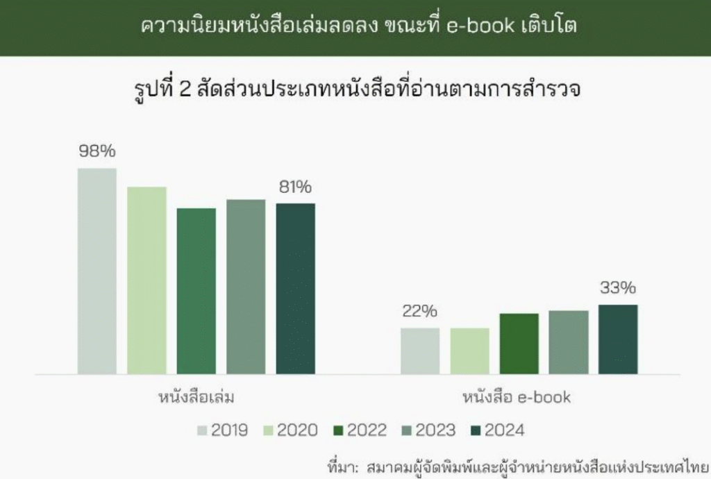 นอกจากนี้ KResearch ยังชี้ให้เห็นอีกว่า ในช่วง 5 ปีที่ผ่านมา แนวโน้มการอ่านหนังสือเล่มกำลังลดลงสวนทางการอ่านหนังสือประเภท E-Book อ้างอิงข้อมูลจากสมาคมผู้จัดพิมพ์และผู้จำหน่ายหนังสือแห่งประเทศไทย