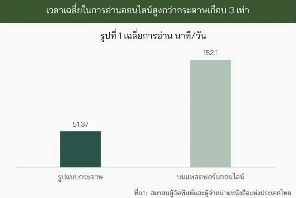จุดที่น่าสนใจคือนักอ่านไทยอ่านหนังสือผ่านช่องทางออนไลน์ เช่น E-Book มากขึ้น โดยใช้เวลาอ่านเฉลี่ยบนช่องทางนี้กว่า 152.1 นาที/วัน ส่วนหนังสือเล่มอยู่ที่ 51.37 นาที/วัน เท่านั้น