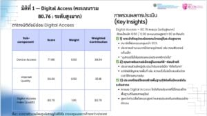 ผลการสำรวจพบว่า ประเทศไทยได้คะแนนด้าน ‘การเข้าถึงเทคโนโลยี’ (Digital Access) สูงถึง 80.76 คะแนน ใกล้เคียงกับค่าเฉลี่ยประเทศพัฒนาแล้วในสหภาพยุโรปที่อยู่ในช่วง 80-90 คะแนน และสูงกว่าค่าเฉลี่ยโลกที่ประมาณ 70 คะแนน รวมถึงสูงกว่าหลายประเทศในอาเซียน เช่น มาเลเซีย เวียดนาม และอินโดนีเซีย อย่างชัดเจน