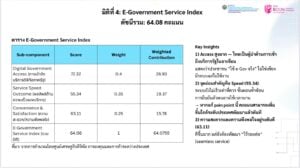 ด้าน ‘การใช้บริการภาครัฐดิจิทัล’ (E-Government Services) ได้คะแนน 64.08 คะแนน ถือว่าอยู่ในระดับที่ดี ประชาชนเข้าถึงบริการได้ง่ายขึ้น แต่ยังมีข้อจำกัดสำคัญด้านความเร็ว ความเชื่อมโยงของระบบ และความลื่นไหลของการให้บริการ ซึ่งยังไม่ลื่นไหลเท่าที่ควร