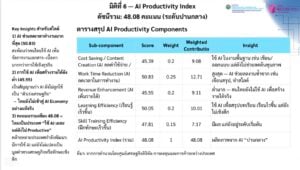 ในมิติ ‘ผลิตภาพจากการใช้ AI’ (AI Productivity) ไทยได้คะแนน 48.08 อยู่ในระดับปานกลาง โดยประชาชนรับรู้ว่า AI ช่วยลดเวลาการทำงานได้ค่อนข้างมาก แต่กลับช่วยเพิ่มรายได้ได้น้อยที่สุด สะท้อนว่า คนไทยยังใช้ AI เพื่อความสะดวกสบายมากกว่าการนำไปต่อยอดเชิงเศรษฐกิจ