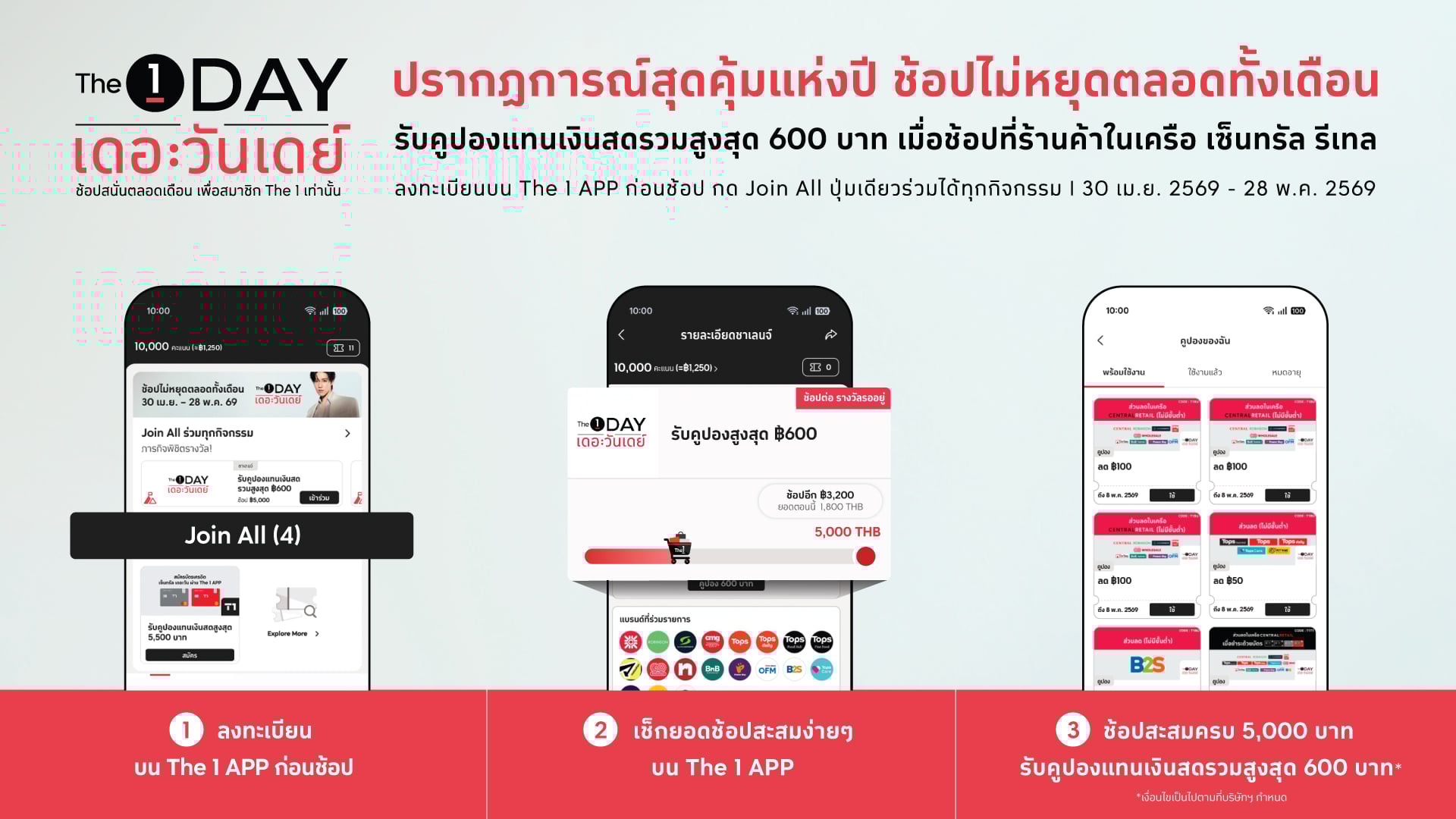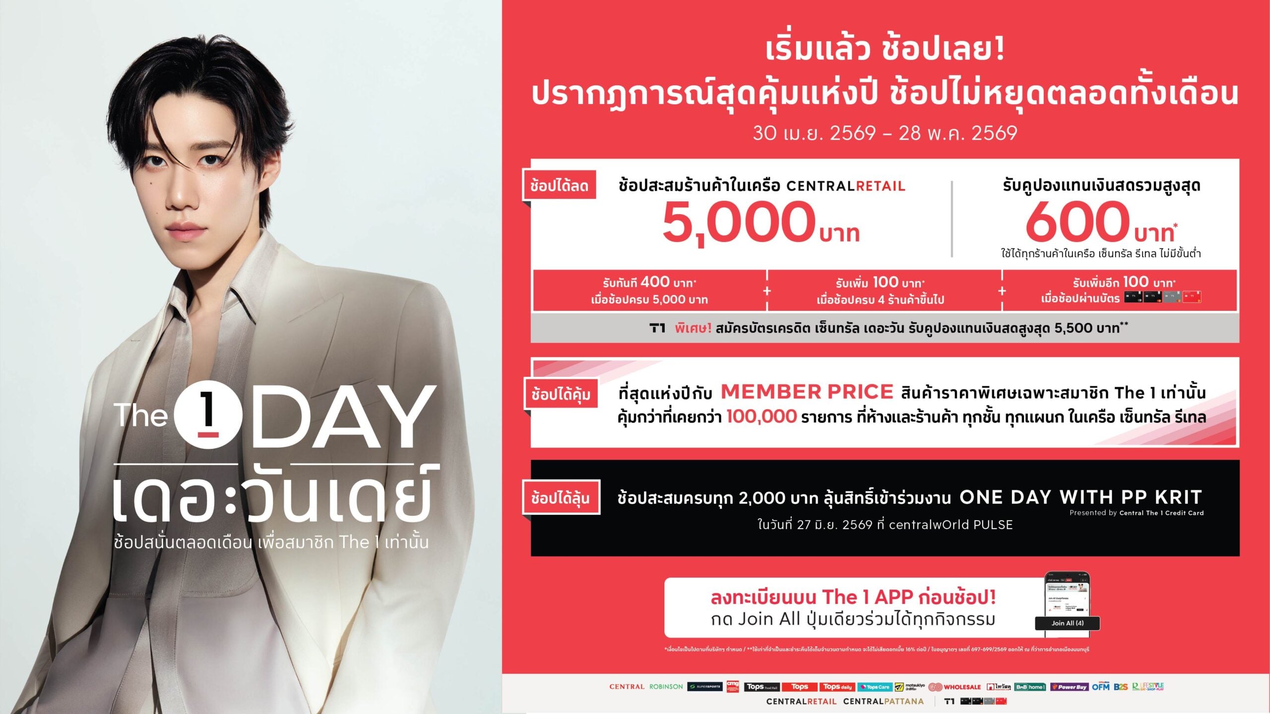 The 1 ผู้นำด้านดิจิทัลไลฟ์สไตล์และลอยัลตี้ในฐานะ Center of Life Platform อันดับ 1 ของไทยและ 5 อันดับแรกในเอเชีย ภายใต้กลุ่มเซ็นทรัล กลับมาอย่างยิ่งใหญ่กว่าที่เคย กับ “The 1 Day 2026” ปรากฏการณ์สุดคุ้มแห่งปี ช้อปไม่หยุดตลอดทั้งเดือน ขยายช่วงเวลาแห่งความคุ้มค่าถึง 1 เดือน ระหว่างวันที่ 30 เมษายน 2569 – 28 พฤษภาคม 2569 เพื่อสมาชิก The 1 ทุกคน โดยมอบประสบการณ์ช้อปได้ลด! เมื่อช้อปสะสมครบ 5,000 บาท ที่ร้านค้าในเครือ เซ็นทรัล รีเทล รับคูปองแทนเงินสดรวมสูงสุด 600 บาท ช้อปได้คุ้ม! พบสินค้า MEMBER PRICE ราคาพิเศษเฉพาะสมาชิก The 1 เท่านั้น คุ้มกว่าที่เคยกว่า 100,000 รายการ ที่ห้างและร้านค้า ทุกชั้น ทุกแผนก ในเครือ เซ็นทรัล รีเทล ช้อปได้ลุ้น! ช้อปสะสมครบทุก 2,000 บาท ลุ้นสิทธิ์เข้าร่วมงาน ‘ONE DAY WITH PP KRIT Presented by Central The 1 Credit Card’ ใกล้ชิดกับ พีพี-กฤษฏ์ ศิลปินระดับประเทศ ที่จะมาสร้างช่วงเวลาแห่งความประทับใจให้กับสมาชิก The 1 แบบใกล้ชิดกว่าที่เคย ในวันที่ 27 มิถุนายน 2569 ณ centralwOrld PULSE