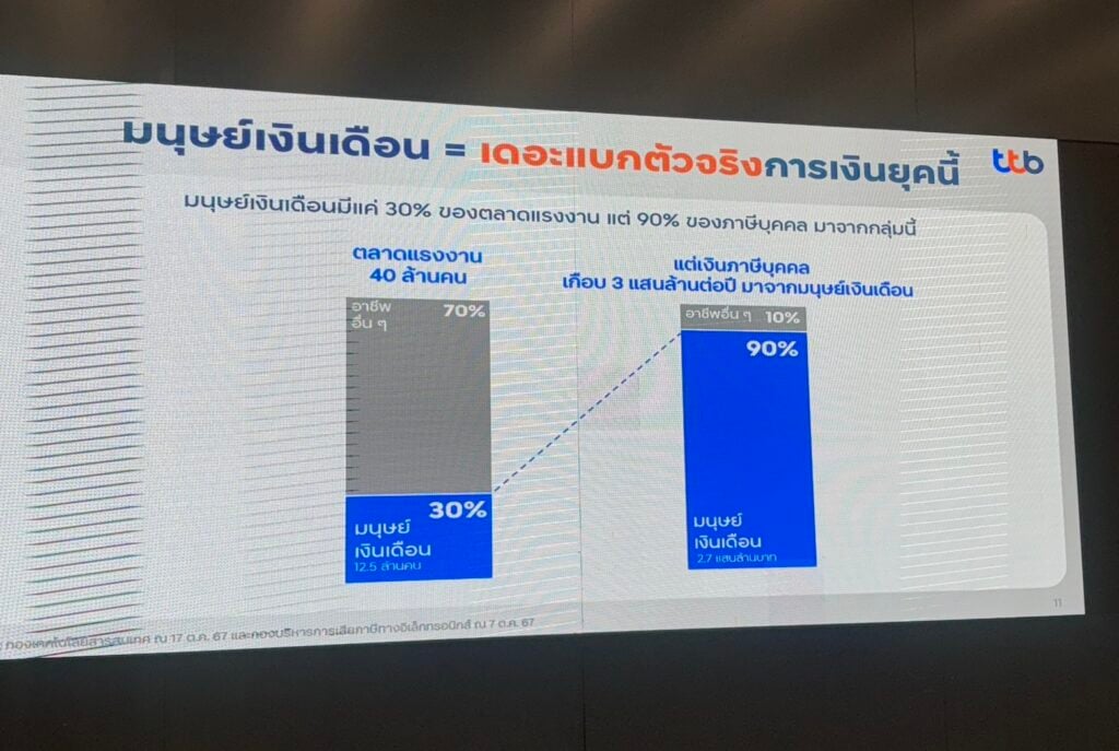 นริศ สถาผลเดชา ประธานกลุ่ม Data และ Analytics ของ ttb บอกว่า ประเทศไทยมีมนุษย์เงินเดือนกว่า 12.5 ล้านคน คิดเป็น 30% ของแรงงานทั้งหมด แต่สร้างรายได้ภาษีมากถึง 90% (หรือ 2.7 แสนล้านบาท) แต่ตอนนี้คนกลุ่มนี้เจอกับความเสี่ยงรอบด้าน คือ มีหนี้ ไร้เงินออม-เงินฉุกเฉิน ชีวิตเดือนชนเดือน แม้รายได้สูง