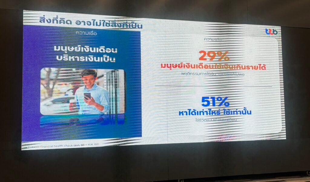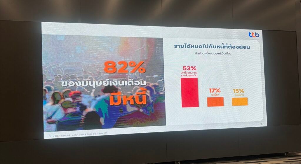 โดย ttb ได้เก็บข้อมูลสุขภาพการเงินของมนุษย์เงินเดือนในประเทศไทยผ่านโปรแกรม ttb financial health check ระหว่างเดือนสิงหาคม 2566-กุมภาพันธ์ 2568 และพบว่า 82% ของมนุษย์เงินเดือนไทยมีภาระหนี้