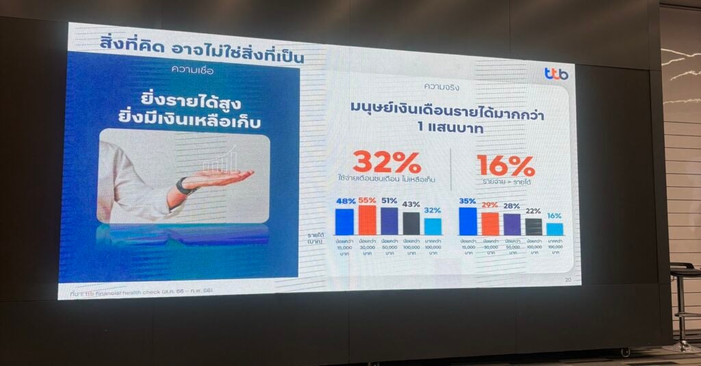 ซึ่ง ttb บอกว่า สถิตินี้สะท้อนว่าความไม่มั่นคงทางการเงินสามารถเกิดขึ้นได้กับคนในทุกระดับรายได้ หรือสรุปง่ายๆ ว่ามนุษย์เงินเดือนไทยตอนนี้ ‘แบกความเสี่ยง’ ทางการเงินมากกว่าที่หลายคนคิด เพราะไม่มีเงินออมฉุกเฉิน รายได้หมดไปกับหนี้ต้องผ่อน ยังจ่ายไหวแต่ไม่มีเงินเหลือใช้ ไม่มีแผนเกษียณ และไม่มีความคุ้มครอง