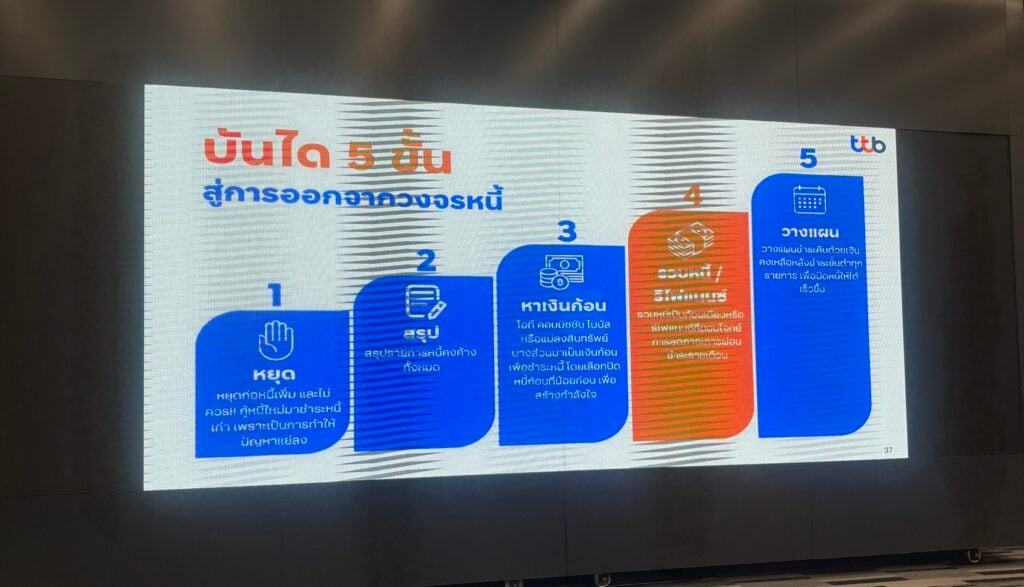 ttb แนะนำ บันได 5 ขั้นออกจากวงจรหนี้ 1) หยุดก่อหนี้เพิ่ม ไม่กู้หนี้ใหม่มาชำระหนี้เก่า ทำให้ปัญหาแย่ลง 2) สรุปรายการหนี้คงค้างทั้งหมด 3) หาเงินก้อน โอที คอมมิชชัน โบนัส แปลงทรัพย์สินมาเป็นเงินก้อน เพื่อจ่ายหนี้ เลือกปิดหนี้ก้อนน้อยก่อน สร้างกำลังใจ 4) รวบหนี้ รีไฟแนนซ์ ลดภาระการผ่อนชำระรายเดือน และ 5) วางแผนจ่ายคืนด้วยเงินคงเหลือชำระขั้นต่ำทุกรายการ ปิดหนี้ให้ได้เร็วขึ้น