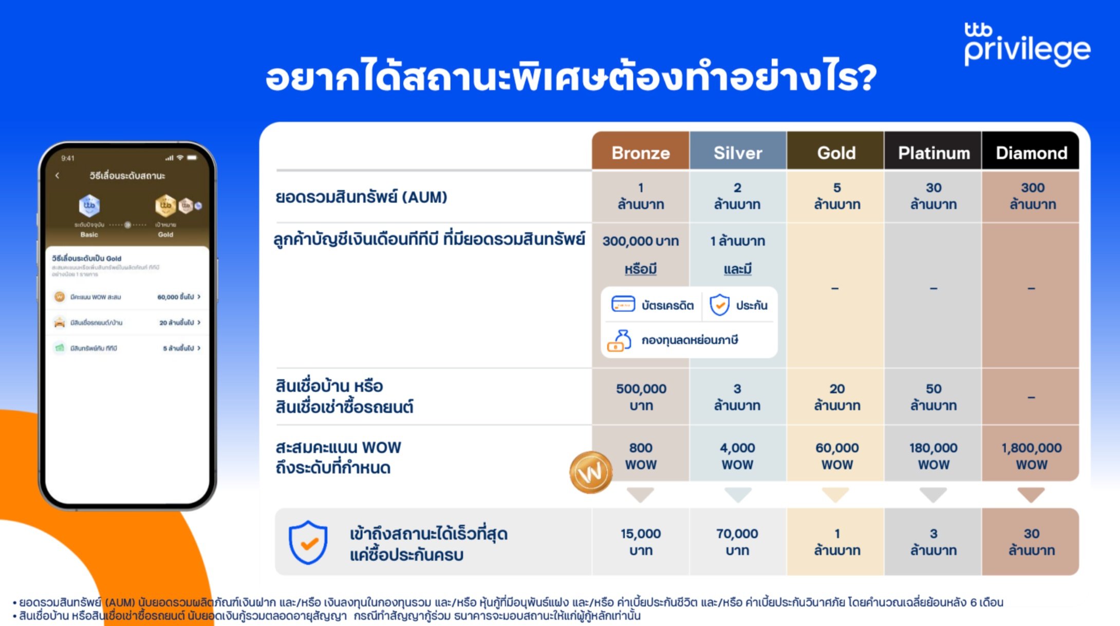 ttb privilege แบ่งระดับความพรีเมียมออกเป็น 6 ขั้น ได้แก่ Basic, Bronze, Silver, Gold, Platinum และ Diamond โดยมี 3 กลไกหลักในการขับเคลื่อนคือ