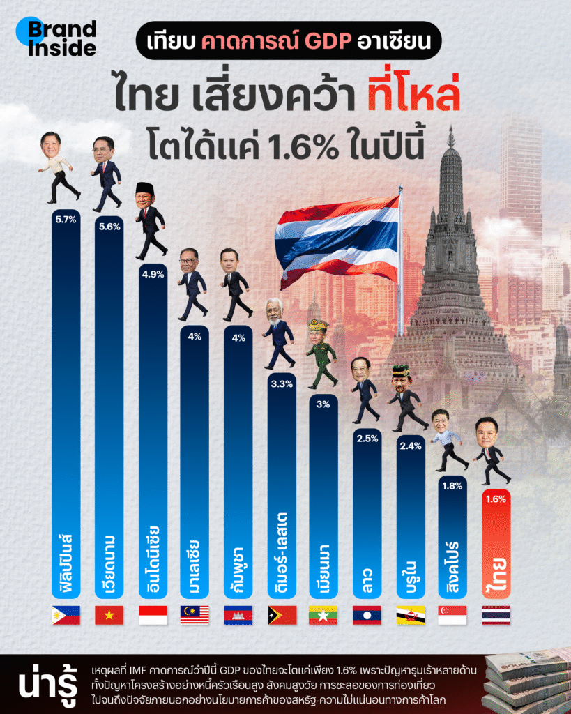 เมื่อ World Economic Outlook (ฉบับเดือนตุลาคม 2568) ของ IMF ได้คาดการณ์ไว้ว่า GDP ไทยในปี 2569 นี้จะเติบโตเพียง 1.6% ต่ำสุดในบรรดาชาติอาเซียน ขณะที่ฟิลิปปินส์และเวียดนามยังโตแรงเกิน 5% ต่อเนื่อง